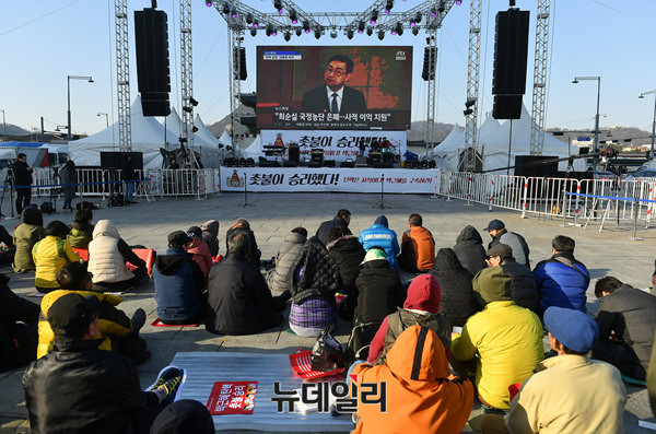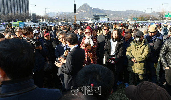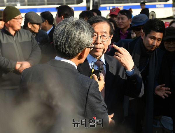 박원순 서울시장이 대통령 탄핵 심판이 결정된 10일 오후 광화문 광장에서 한 인터넷 매체와 인터뷰를 하고 있다. 이날 오후 7시부터 광화문 광장에는 '촛불이 승리했다'를 주제로 떼촛불집회가 예정 돼 있다.