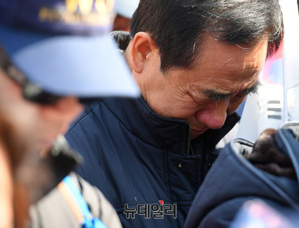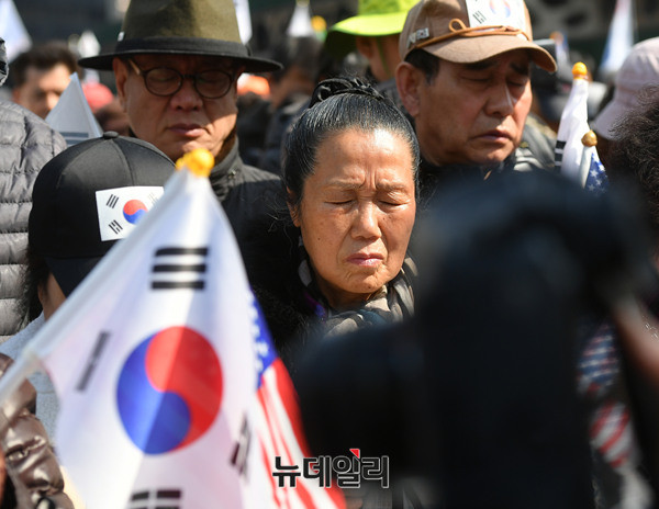 태극기집회의 한 참가자가 11일 오후 2시부터 대한문 앞에서 열린 대통령탄핵무효국민저항총궐기운동본부 태극기 집회에서 눈물을 훔치고 있다.