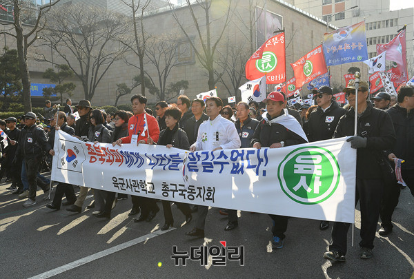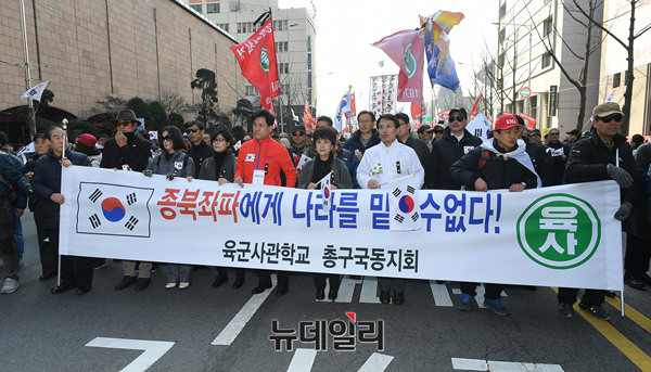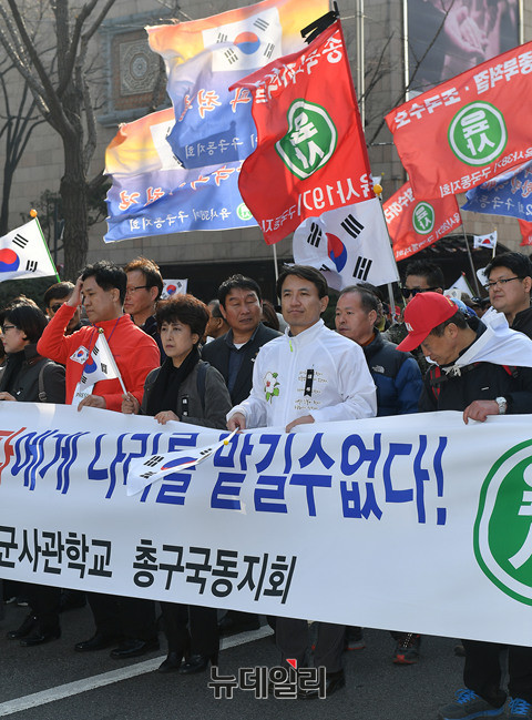 김진태 자유한국당 의원과 정미홍 전 아나운서가 11일 오후 대한문에서 열린 대통령탄핵무효국민저항총궐기운동본부 태극기 집회에서 1부행사 직후 을지로 방향으로 선두에서 가두행진을 하고 있다. 참가자들은 대형 태극기와 성조기를 흔들며 탄핵무효를 외쳤다.