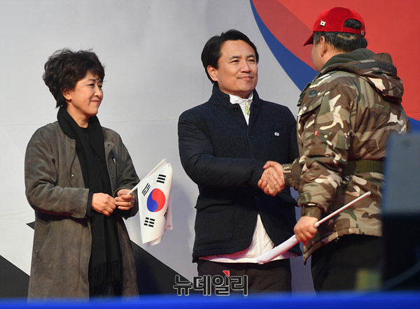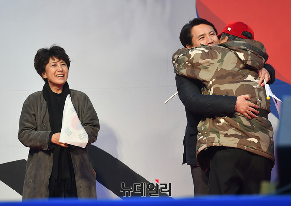 김진태 자유한국당 의원과 정광용 탄기국 대변인이 11일 오후 대한문에서 열린 대통령탄핵무효국민저항총궐기운동본부 태극기 집회에서 악수를 나누고 있다. 1부행사 직후 을지로 방향으로 가두행진이 진행됐다. 참가자들은 대형 태극기와 성조기를 흔들며 탄핵무효를 외쳤다.