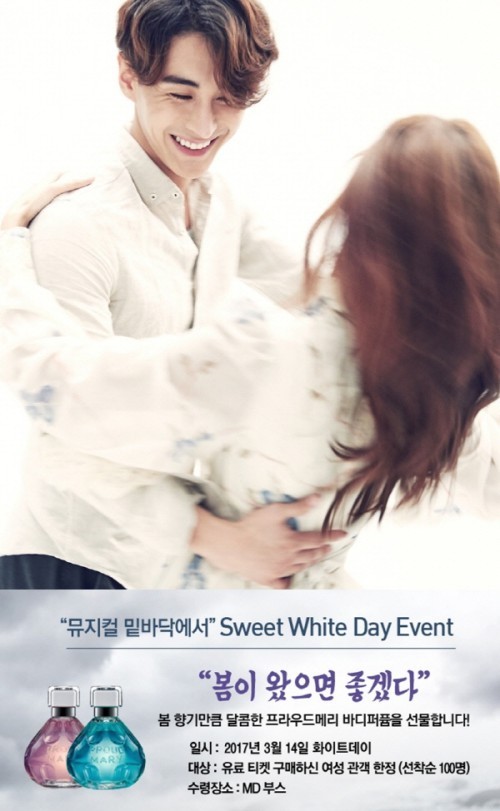 뮤지컬 '밑바닥에서'가 14일 화이트데이를 앞두고 연인만을 위한 이벤트가 아닌 친구 또는 가족 간의 사랑과 우정을 응원하는 이벤트를 마련했다. 이날 공연 티켓을 구매하는 여성 관객에게 프라우드 메리 바디퍼퓸 정품을 증정할 예정이다.