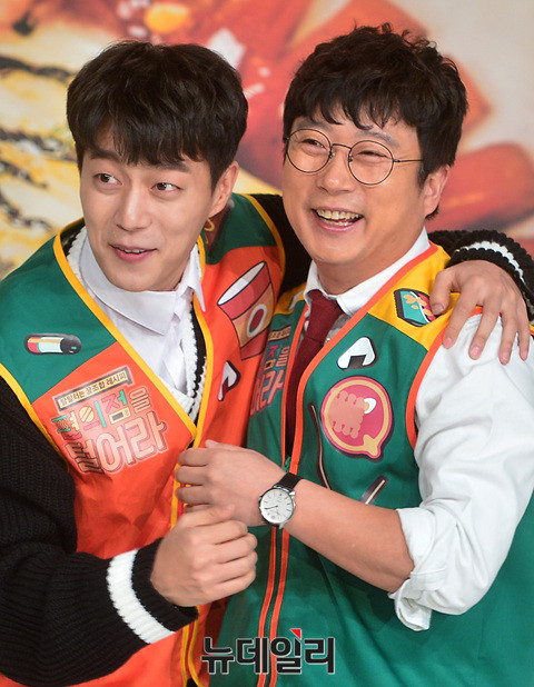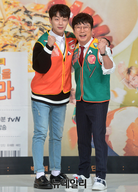 tvN 예능프로그램 '편의점을털어라'의 MC 윤두준, 이수근이 13일 오전 서울 영등포 타임스퀘어에서 열린 '편의점을털어라' 기자간담회에 참석해 포토타임을 갖고있다.