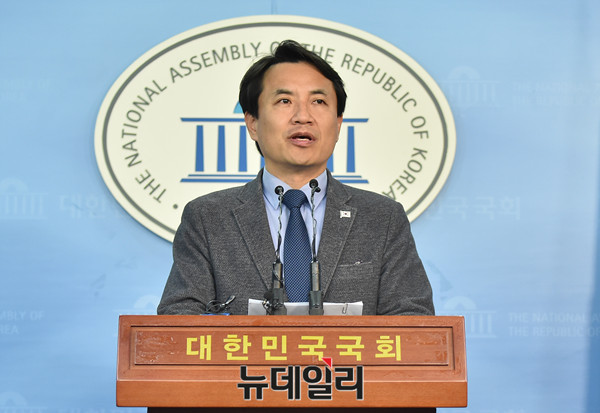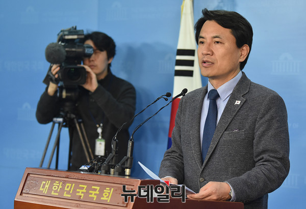 자유한국당 김진태 의원이 13일 오전 국회 정론관에서 기자회견을 갖고 헌법재판소의 박근혜 전 대통령에 대한 파면 선고를 반박하고 있다.