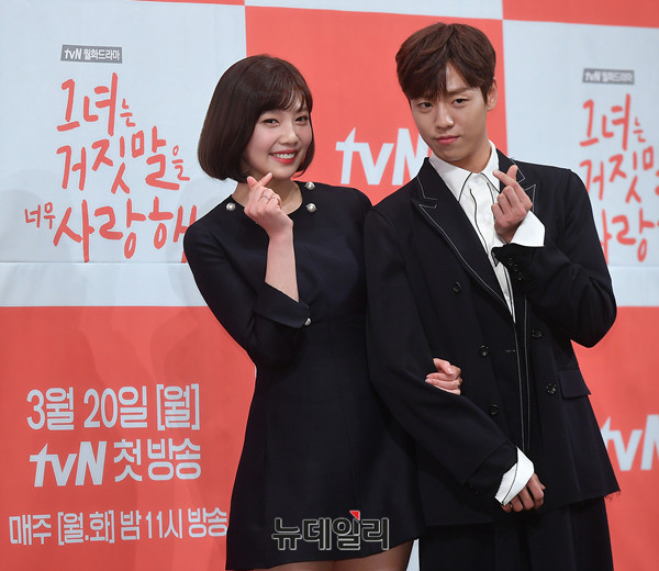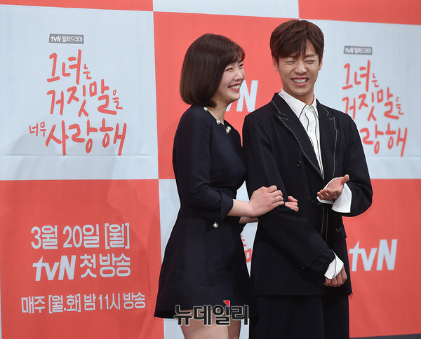 배우 이현우(오른쪽)와 레드벨벳 조이가 14일 오후 서울 강남구 임피리얼팰리스 호텔에서 열린 tvN월화드라마 '그녀는 거짓말을 너무 사랑해(연출 김진민, 극본 김경민)' 제작보고회에서 포토타임을 갖고 있다.
