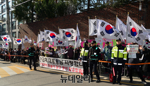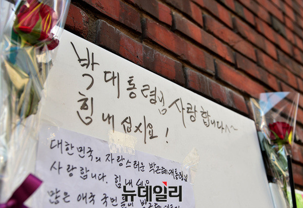 박근혜 전 대통령 지지자들이 14일 오후 서울 강남구 삼성동 사저 벽에 장미꽃과 격려의 메시지를 남겼다. 이날 지지자들은 사저 주변 거주자에게 피해를 주지 않기 위해 태극기를 흔들며, 차분하게 집회를 이어갔다.
