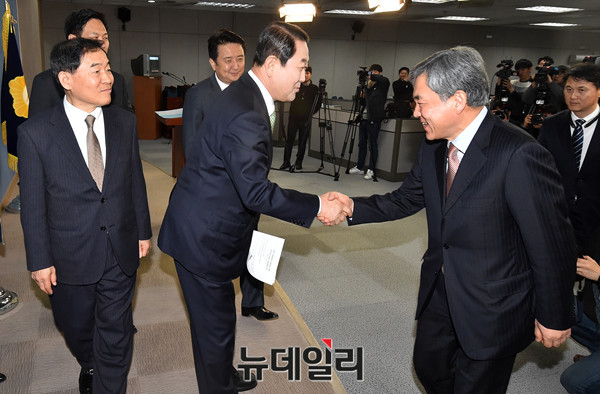국민의당 박주선 의원이 15일 오전 국회 정론관에서 대선 출마선언 기자회견을 마치고 이상돈 의원과 인사를 나누고 있다.