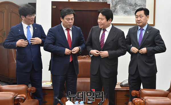 교섭단체 4당 원내수석부대표가 15일 국회에서 회동을 갖기에 앞서 옷 매무새를 고치고 있다.
