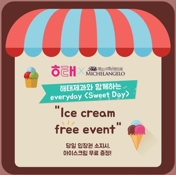 컨버전스 아트 '헬로,미켈란젤로展'이 봄을 맞아 달달한 이벤트를 마련했다.본다빈치에 따르면 오는 21일터 매일 오후 1~8시 입장권 소지자에 한해 아이스크림을 1인 1개씩 무료로 증정하는 '에브리 데이 스위트 데이: 아이스크림 free 이벤트'를 펼친다.아이스크림은 전시를 관람을 마치고 아트샵 출구 쪽 냉동고가 비치된 곳에서 받을 수 있다. 행사는 아이스크림이 소진될 때까지 진행되며, 해태제과의 쌍쌍바, 폴라포, 아이스가이, 브라보 바닐라콘 등을 맛볼 수 있다.본다빈치는 "전시장을 찾은 많은 이들이 미켈란젤로의 컨버전스 아트 작품을 여유 있게 감상하고, 관람 후 달콤한 아이스크림과 함께 즐겁고 행복한 마음으로 돌아 가길 바란다"고 전했다.'헬로,미켈란젤로展'은 이탈리아의 대표적 조각가이자 건축가·화가·시인으로 활약한 전방위 예술가 미켈란젤로 부오나로티의 삶과 작품을 '위로'라는 콘셉트로 스토리텔링한 전시다.오전 10시부터 오후 8시 30분까지 관람할 수 있으며, 휴관일은 매주 월요일이다. 예매는 티켓링크와 인터파크 티켓에서 가능하다.