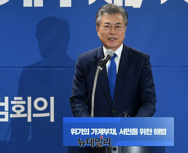더불어민주당 문재인 대선주자가 16일 오전 서울 마포구 서울신용보증재단 7층 회의실에서 '위기의 가계부채, 서민을 위한 해법'을 주제로 진행된 '비상경제대책단 제2차 경제현안 점검회의'에 참석했다. 이날 회의에는 김준영 경제인문사회연구회 이사장이 참석했다.
