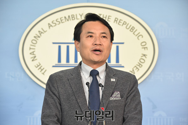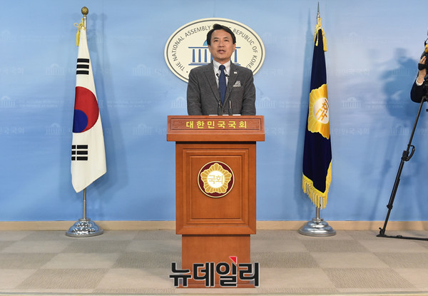대선출마를 선언한 김진태 자유한국당 의원이 16일 오전 국회 정론관에서 기자회견을 갖고, 문재인 더불어민주당 전 대표의 '청와대 압수수색 촉구 발언'과 홍준표 경남도지사의 '박근혜 전 대통령을 머리에서 지우고 우파결집' 이라는 발언을 비판하고 있다.