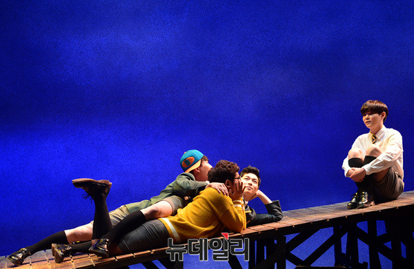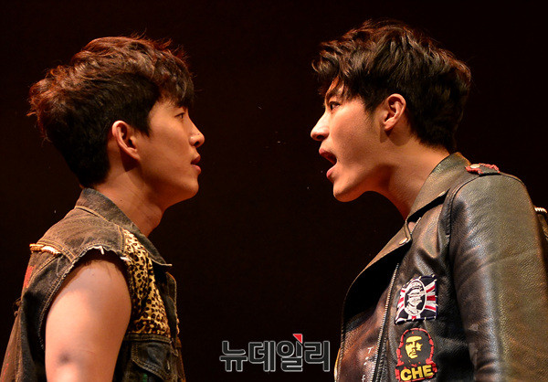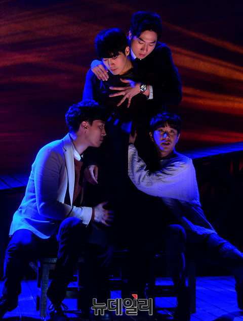 연극 '나쁜자석'의 배우들(문태유, 이창엽, 안재영, 우찬)이 16일 오후 서울 대학로 아트원씨어터에서 열린 프레스콜에서 하이라이트 장면을 시연하고 있다.