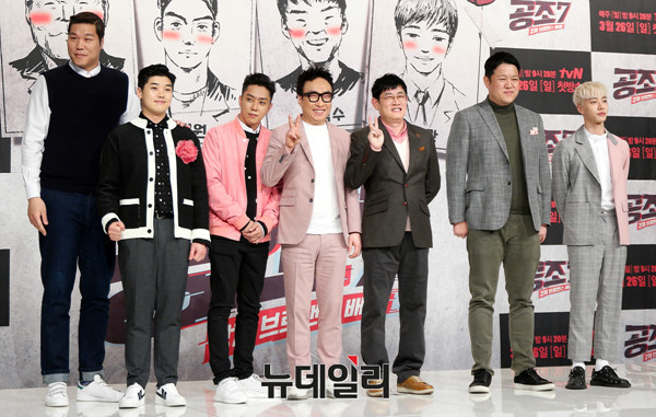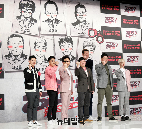 방송인 서장훈, 권혁수, 은지원, 박명수, 이경규, 김구라, 이기광(왼쪽부터)이 17일 오전 서울 영등포구 타임스퀘어 아모리스홀에서 열린 tvN 예능 '공조7(연출 전성호)' 제작발표회에 참석해 포토타임을 갖고 있다.