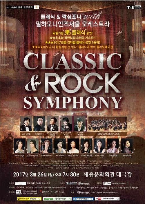 '클래식&락심포니' 공연이 더 막강해진 출연진들과 함께 오는 26일 세종문화회관 대강당에서 화려한 막을 올린다.이번 공연은 세계 무대에서 활동하고 있는 플루티스트 박태환이 총 음악감독을 맡았으며, 배우 지현우가 스페셜 게스트로 출연한다.1부는 정통 클래식 명곡들로 꾸며진다. 마에스트로 장민호가 필하모니안즈서울 오케스트라를 진두지휘하며 플루티스트 김보영, 소프라노 박윤미, 바이올리니스트 이민아, 첼리스트 김명주, 피아니스트 권수완 등이 클래식의 진수를 선보인다.2부에서는 그룹 넥스트의 키보디스트이자 지현우의 형인 뮤지션 지현수가 70인조의 웅장한 필하모니안즈서울 오케스트라, 화려한 라인업의 솔리스트들과 협연해 색다른 무대를 보여준다.바이올리니스트 송선희, 비올리스트 박선경이 지현수와 함께 비발디의 사계 중 '여름'과 '겨울'을 협연하며 대금연주가 정소희, 해금연주가 김민정이 참여해 신비하고 단아한 우리 음악의 매력을 들려준다.공연을 기획한 박태환 음악감독은 "올해 4번째로 선보이는 '클래식&락심포니'는 기존보다 더 많은 장르의 음악과 클래식을 화합하면서 다양한 음악들을 통해 관객과의 교감을 높였다"고 밝혔다.'클래식&락심포니'는 세종티켓과 인터파크에서 예매할 수 있다. 입장료는 2만~8만원.[사진=티앤비엔터테인먼트]