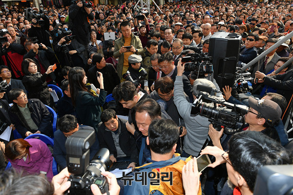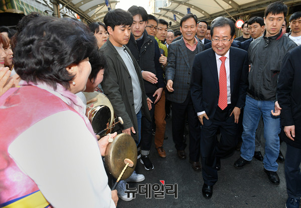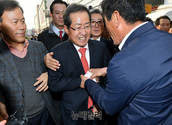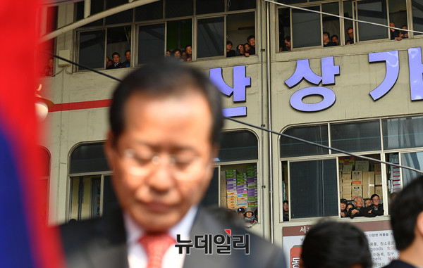 홍준표 자유한국당 대선주자가 18일 오후 대구 서문시장에서 대선출마를 공식 선언후 서문시장을 둘러보고 있다. 홍 주자는 이날 "쓰러져가는 우파 보수세력을 다시 일으켜 세우겠다"며 출사표를 던졌다. 다음은 출마선언문 전문이다. (대구=뉴데일리 정상윤 기자)