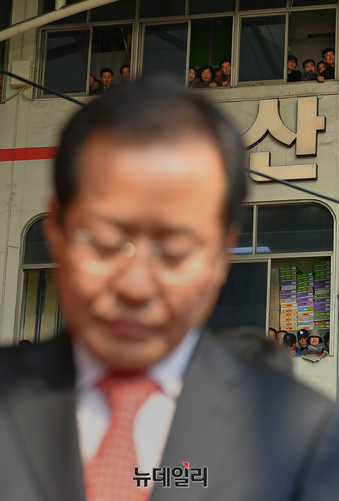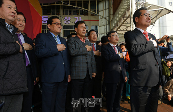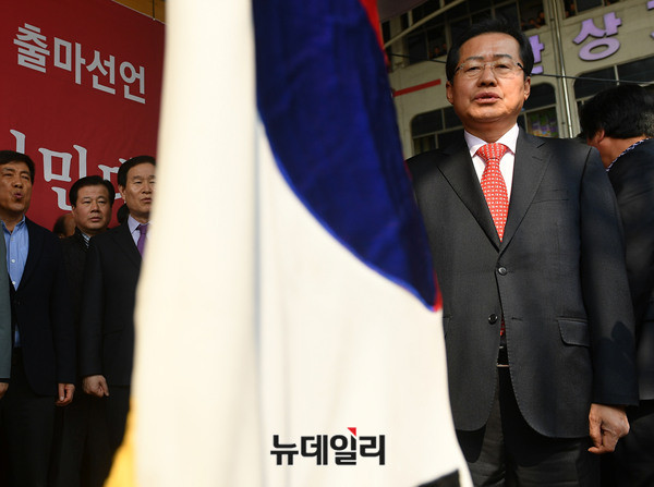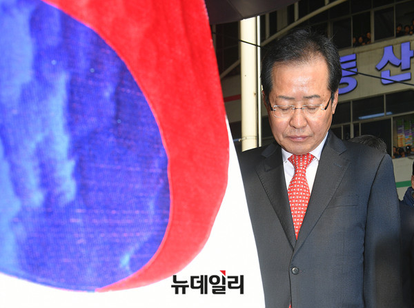 홍준표 자유한국당 대선주자가 18일 오후 대구 서문시장에서 대선출마를 공식 선언 전 국민의례를 하고 있다. 홍 주자는 이날 "쓰러져가는 우파 보수세력을 다시 일으켜 세우겠다"며 출사표를 던졌다.