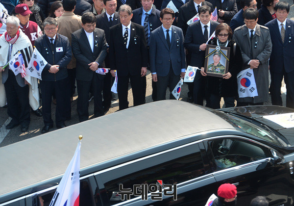 故 김해수·김완식·이정남 애국열사 애국 국민장 운구행렬이 18일 오후 안국역 부근에서 화장장으로 이동하는 운구차량을 바라보고 있다.