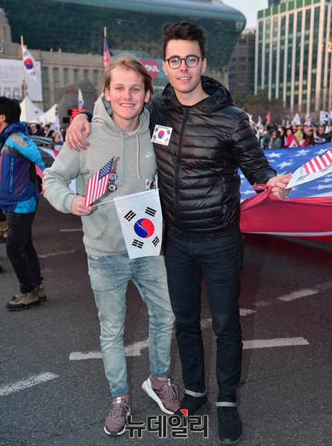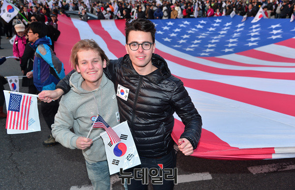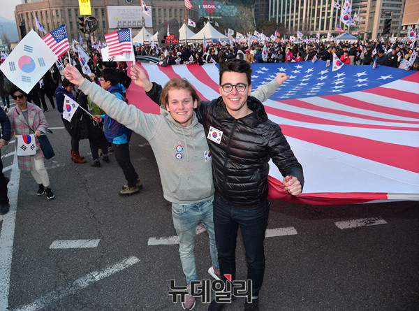 태극기와 성조기를 나란히 든 외국인이 18일 오후 대한문 인근에서 열린 '제2차 탄핵무효 태극기집회'에 참석해 포즈를 취하고 있다.