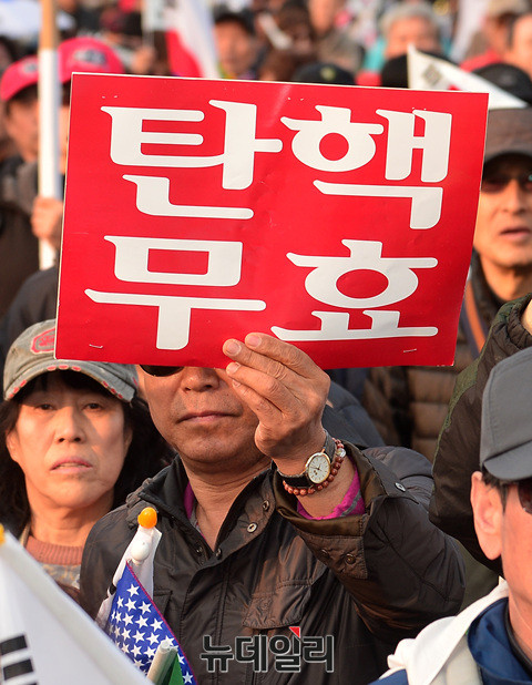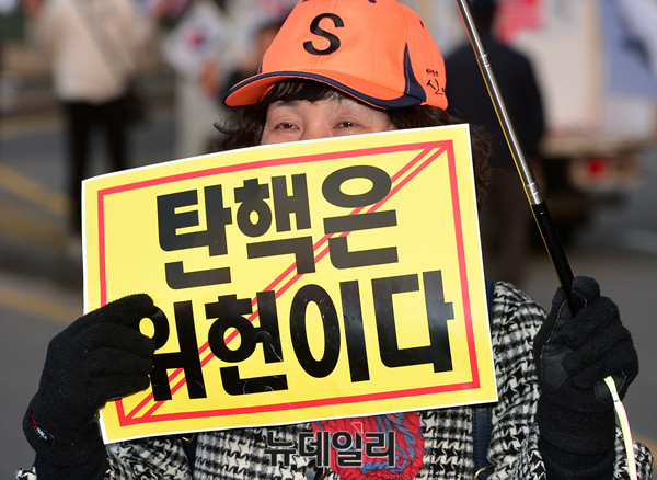 '제2차 탄핵무효 태극기집회'에 참석한 시민이 18일 오후 대한문에서 "탄핵은 위헌이다"라고 적힌 피켓을 들고 있다.