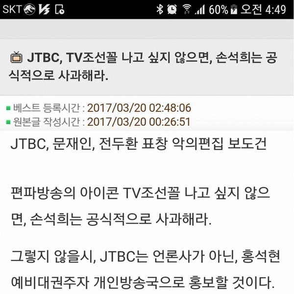 한 네티즌은 20일 오전 오늘의유머(오유) 게시판에 「JTBC, TV조선꼴 나고 싶지 않으면 손석희는 공식적으로 사과해라」는 제하의 글을 올리며 지난 19일 '민주당 후보들의 호남 전략'을 소개한 'JTBC뉴스룸'이 사실과 다른 자막을 내보낸 사실을 문제 삼았다.