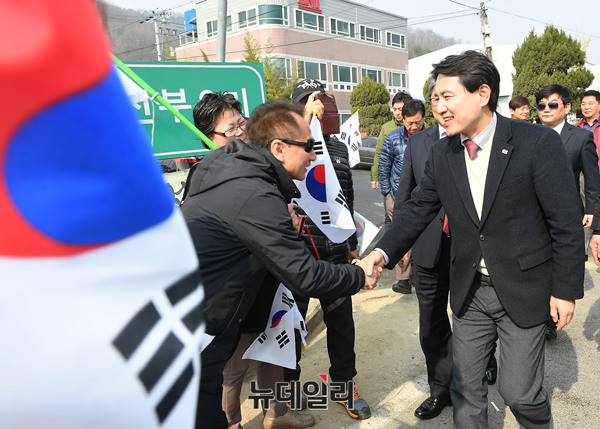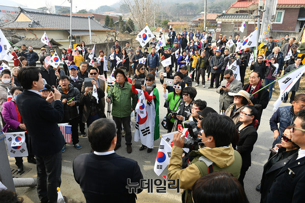 김진태 자유한국당 경선 예비후보가 20일 오전 경북 성주군 선남면에 위치한 조부 묘소를 찾아 참배전 고모와 인사를 나누고 있다. 묘소 참배에는 태극기를 든 지지자들이 김 후보를 기다렸다. 조원진 의원도 김 후보와 동행했다. (경북 성주=뉴데일리 정상윤 기자)