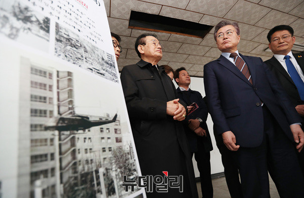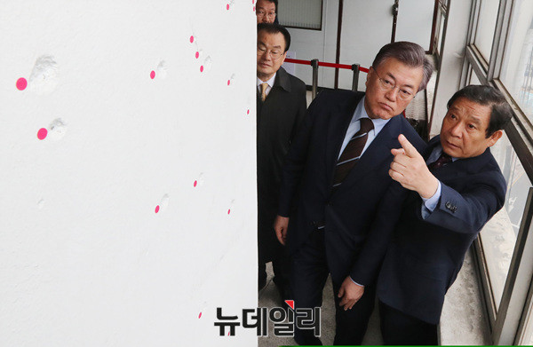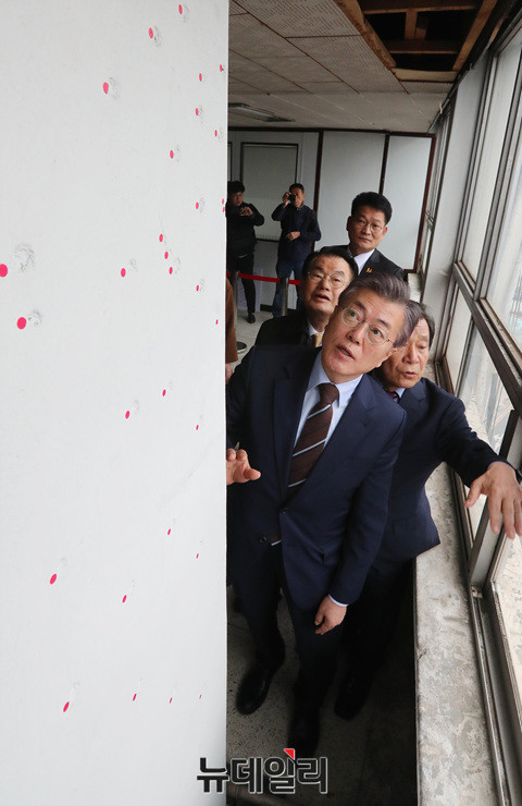 대선출마를 선언한 문재인 전 더불어민주당 대표가 20일 오전 광주 동구에 위치한 5.18민주화운동 헬기사격 탄흔 현장을 방문하고 있다.