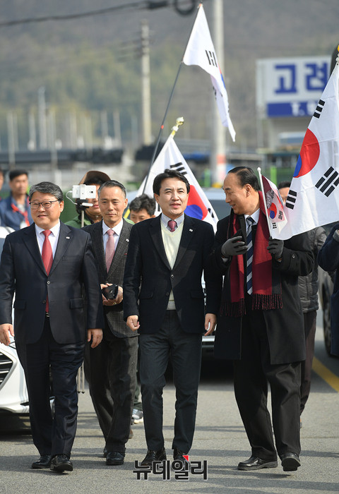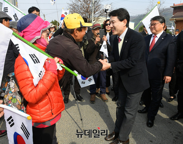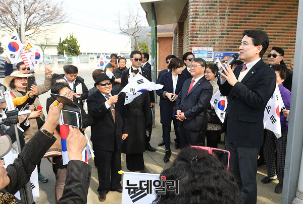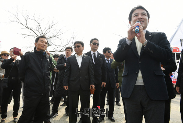 김진태 자유한국당 경선 예비후보가 20일 오전 경북 성주군 선남면에 위치한 조부 묘소를 찾아 참배 하기 전 지지자들에게 인사를 하고 있다. 김 후보는 이날 박정희 전 대통령 생가와 대구 서문시장을 차례로 방문 할 예정이다. (경북 성주=뉴데일리 정상윤 기자)