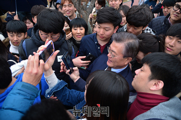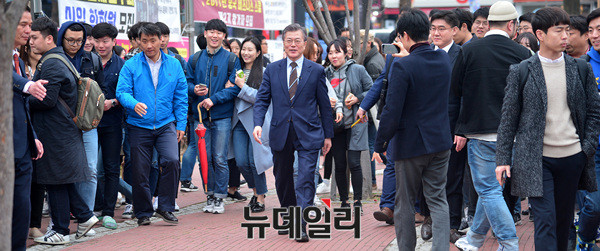 대선출마를 선언한 문재인 전 더불어민주당 대표가 20일 오후 전남대학교 광주캠퍼스 후문 광장에 들어서고 있다. 이날 문 전 대표는 학생들과 '국민과 함께하는 출마선언'이라는 콘셉트로 홍보영상을 촬영하기 위해 전남대학교를 찾았다. (광주=뉴데일리 공준표 기자)