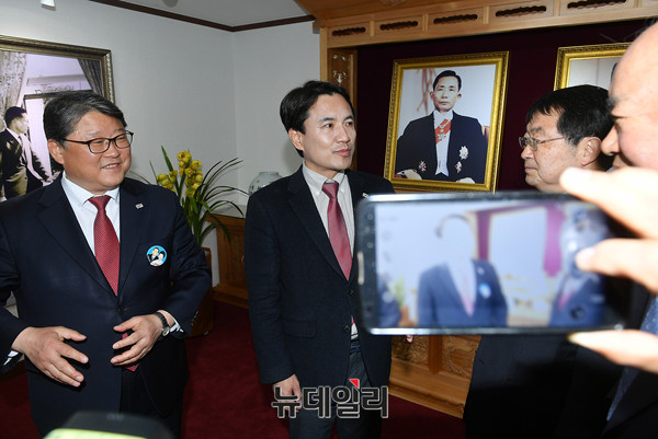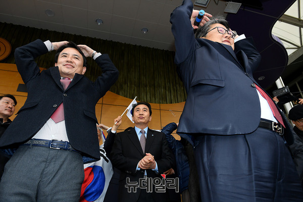 김진태 자유한국당 경선 예비후보(왼쪽)과 조원진 의원(오른쪽)이 20일 오후 대구 서문시장을 방문해 지지자들에게 두 손으로 하트모양을 만들어 보이고 있다. 조원진 의원은 이날 김 후보의 경북, 대구 일정을 동행하며 김 후보를 도왔다.
