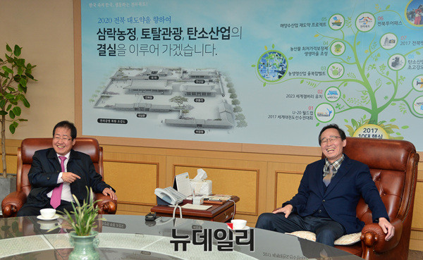 대선출마를 선언한 자유한국당 홍준표 경남지사가 21일 오후 전북도청에서 송하진 전북지사와 간담회를 가지고 있다. 홍 지사와 송 지사는 고려대학교에서 함께 공부한 친구다.