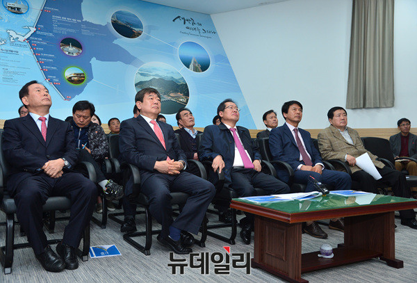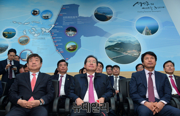 대선출마를 선언한 자유한국당 홍준표 경남지사가 21일 오전 전북 부안군 새만금 홍보관에서 설명을 듣고 있다.