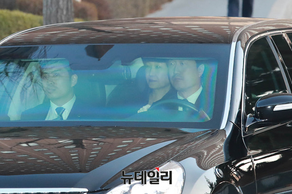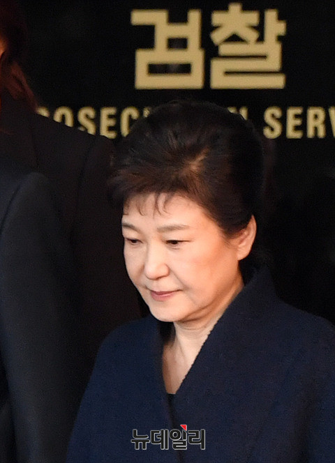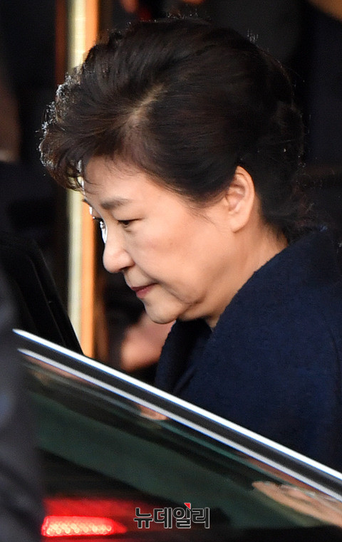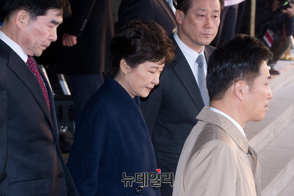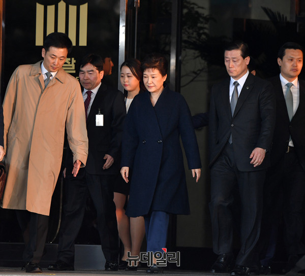 박근혜 전 대통령이 22일 오전 밤샘조사를 마치고 유영하 변호사와 경호인단과 함께 중앙지검 청사를 나서고 있다. 박 전 대통령은 어제 오전 피의자 신분으로 중앙지검에 출석했다. (사진=공동취재단)