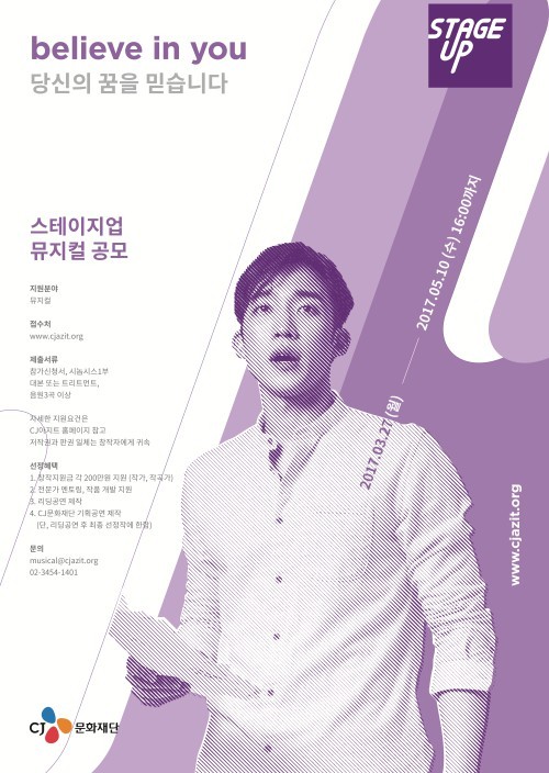 이상준 CJ문화재단 국장은 "스테이지업은 신인 창작자들에게 전문가 멘토링과 코칭을 통해 창작 뮤지컬을 기획·개발할 수 있도록 지원한다"며 "젊은 예술인들이 꿈을 이룰 수 있는 이번 공모를 통해 좋은 콘텐츠를 발굴하겠다"고 밝혔다.