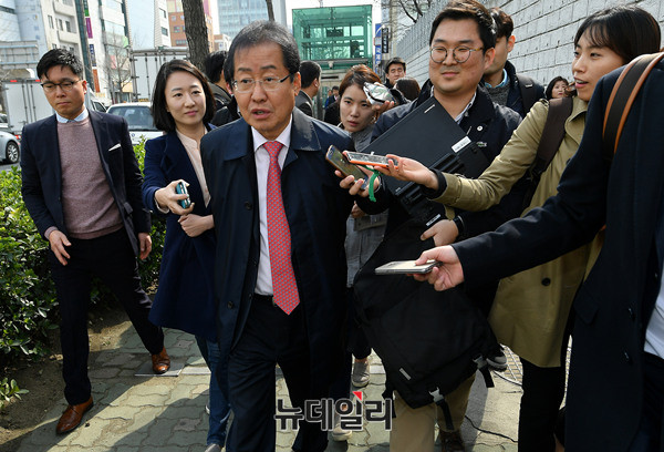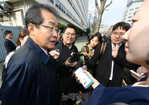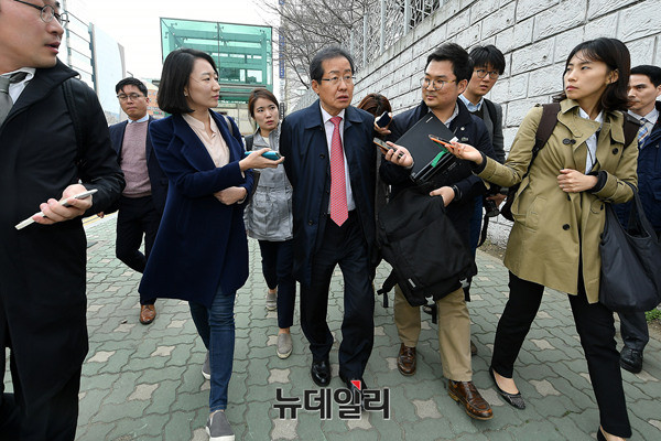 자유한국당 대선주자인 홍준표 경상남도지사가 22일 오후 부산 동구 일본영사관 앞 소녀상을 방문한 직후 기자들의 질문을 받으며 이동하고 있다.