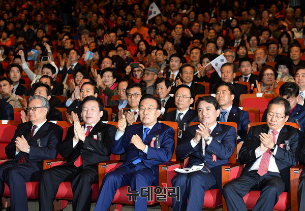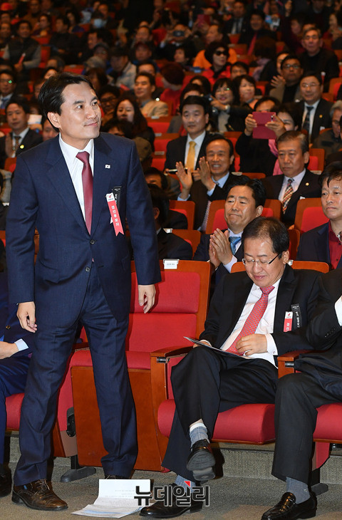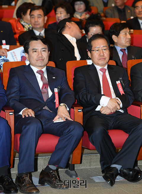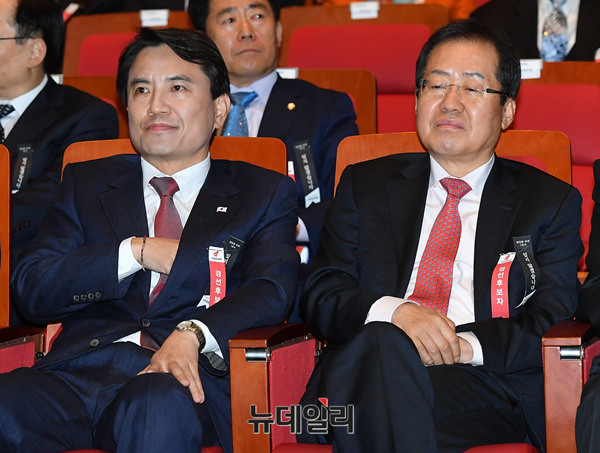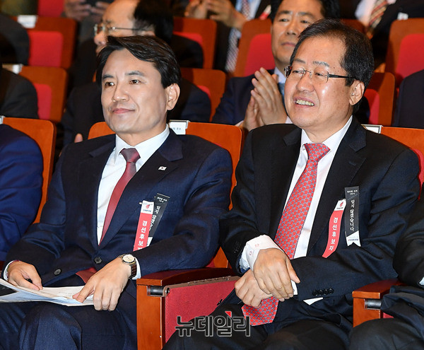 자유한국당 대선주자인 김진태, 홍준표 예비후보가 22일 오후 부산 벡스코 오디토리움에서 열린 '자유한국당 대통령후보자 부산·울산·경남 비전대회'에서 나란히 앉아 있다. 이날 비전대회에는 2차 컷오프를 통과한 김진태, 홍준표, 김관용, 이인제 예비후보가 추첨순서대로 각각 15분 씩 비전 발표를 했다. 후보들은 이날 저녁 영남권 방송3사 TV토론회에 참석할 예정이다. (부산=뉴데일리 정상윤 기자)