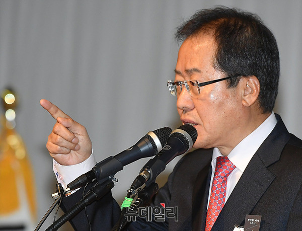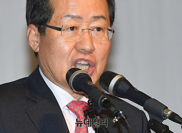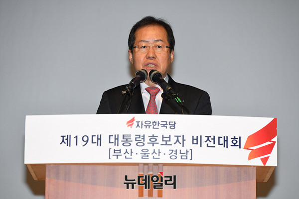 자유한국당 대선주자인 홍준표 예비후보가 22일 오후 부산 벡스코 오디토리움에서 열린 '자유한국당 대통령후보자 부산·울산·경남 비전대회'에서 발언하고 있다. 이날 비전대회에는 2차 컷오프를 통과한 김진태, 홍준표, 김관용, 이인제 예비후보가 각각 15분씩 비전발표를 했다. 후보들은 이날 저녁 영남권 방송3사 TV토론회에 참석할 예정이다.