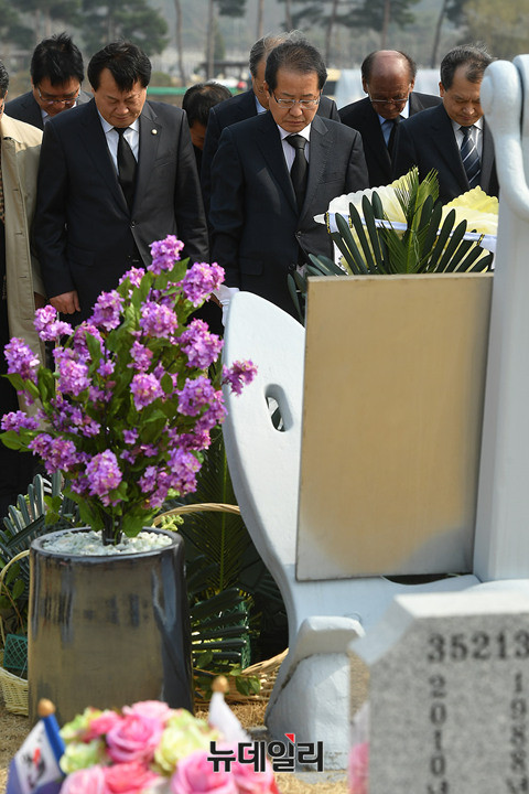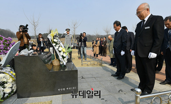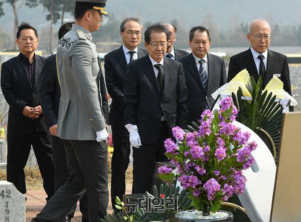 자유한국당 대선주자인 홍준표 경남지사와 권율정 국립대전현충원장이 제2회 서해수호의날을 하루 앞둔 23일 오후 대전 현충원을 찾아 천안함 46용사 묘역 추모비에서 참배하고 있다. 앞서 홍 지사는 현충탑에서 참배하고, 이날 오전 충청권 방송토론회에 참석했다. (대전=뉴데일리 정상윤 기자)