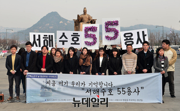 서해수호영웅을추모하는청년이 23일 오전 광화문광장에서 '서해수호의날 청년추모기자회견'을 개최했다. 이번 행사는 오는 24일 제2회 서해수호의 날을 맞아 북한의 서해 북방한계선(NLL) 도발에 맞서 목숨을 바친 호국영웅 55인의 희생을 기리기 위해 기획했다.