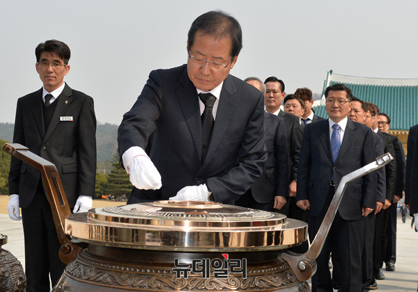 자유한국당 대선주자인 홍준표 경남지사가 제2회 서해수호의날을 하루 앞둔 23일 오후 대전 현충원 현충탑을 찾아 분향하고 있다. 이후 홍 후보는 천안함 46용사 묘역을 찾아 참배했다. (대전=뉴데일리 정상윤 기자)