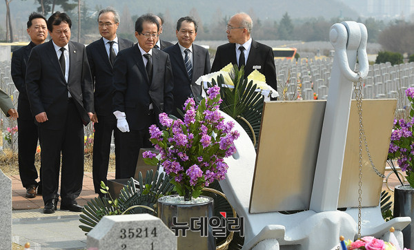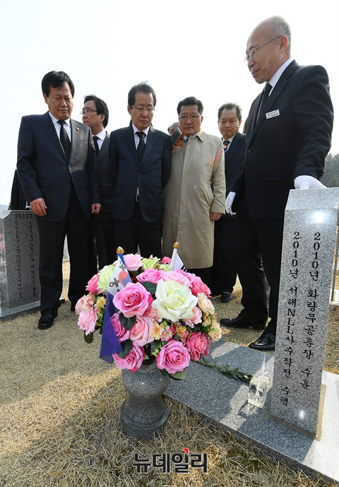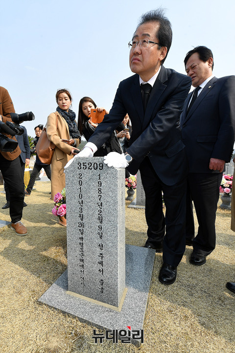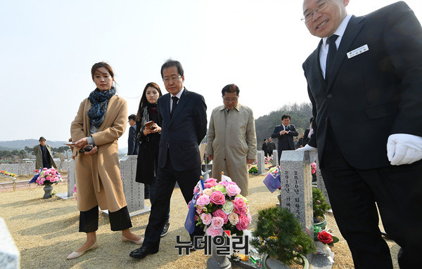 자유한국당 대선주자인 홍준표 경남지사가 23일 오후 대전 현충원에 안장된 천안함 46용사 묘역을 찾아 권율정 국립대전현충원장의 안내로 묘역을 살펴보고 있다. 앞서 홍 지사는 충청권 방송토론회에 참석했다. (대전=뉴데일리 정상윤 기자)