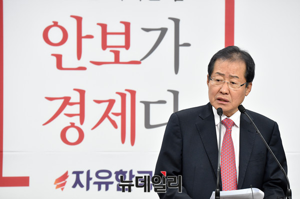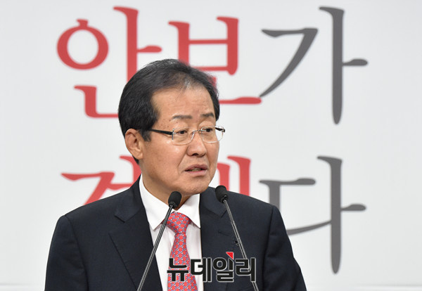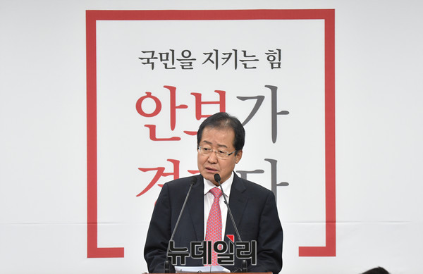 대선출마를 선언한 자유한국당 홍준표 경남지사가 24일 오전 서울 여의도 당사에서 정채발표 기자회견을 깆고 있다.