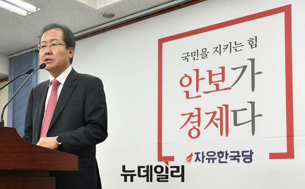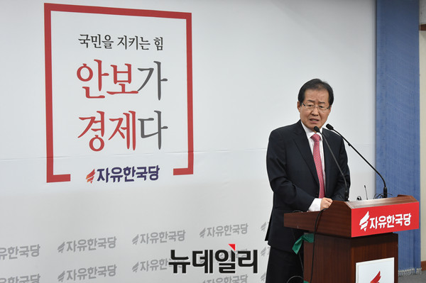 대선출마를 선언한 자유한국당 홍준표 경남지사가 24일 오전 서울 여의도 당사에서 검찰개혁 관련 정채발표 기자회견을 깆고 있다.