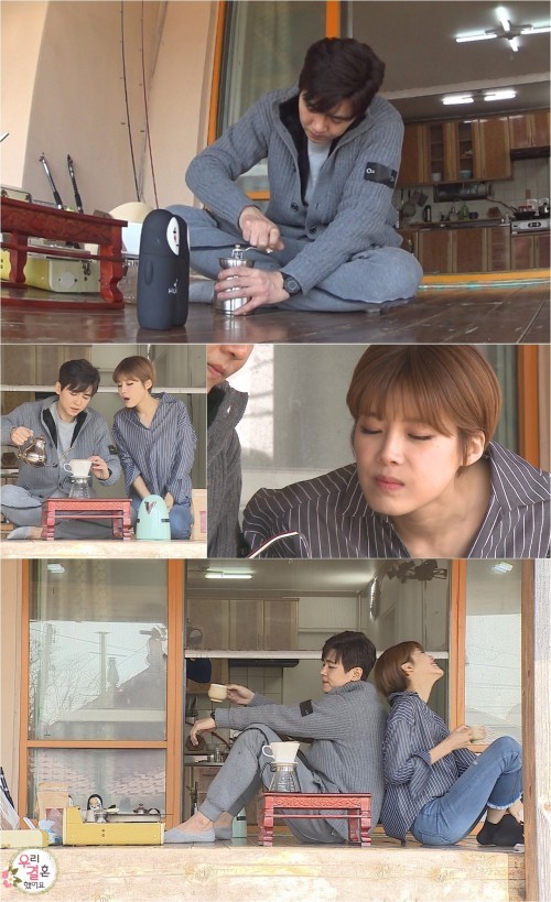 '우결' 최민용이 국화도의 로맨틱 바리스타로 등극했다.25일 방송될 MBC '우리 결혼했어'(이하 '우결')에서는 국화도에서 신혼 첫날밤을 보낸 최민용-장도연의 이튿날 아침 모습이 공개된다.이날 최민용은 만능 짐가방에서 LP 턴테이블과 판을 꺼내 노래를 준비하는가 하면, 직접 가져온 핸드드립 도구들을 이용해 모닝커피까지 만들었다.최민용은 "핸드드립 해 줄게요~ 모닝커피"라며 제조에 들어갔고, 이에 장도연은 "커피 마시고 싶었는데"라며 얼굴 가득 미소를 지었다.최민용은 직접 원두를 갈아 핸드드립으로 커피를 내리는 등 아내의 모닝 커피를 위해 심혈을 기울였고, 장도연은 그런 최민용을 바라보며 "다른 사람 같아 보인다"라며 행복해했다.이어 두 사람은 바다를 앞에 두고 커피를 마시며 나른한 기운에 젖어 들었고, 등을 맞댄 채 서로의 온기를 느끼는 등 한 편의 커피 CF 같은 순간들을 연출했다.최민용의 달콤한 매력 발산 현장은 25일 오후 4시 55분 '우리 결혼했어요'에서 확인할 수 있다.['우리결혼했어요' 최민용 장도연, 사진=MBC]