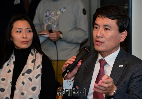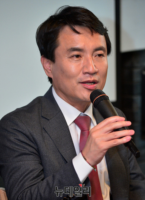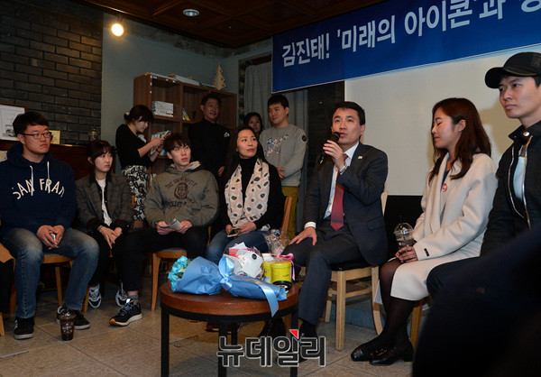 대선출마를 선언한 김진태 자유한국당 의원이 24일 오후 서울 마포구의 한 카페에서 열린 '김진태! 미래의아이콘과 청년들의만남'에 참석해 질문에 답하고 있다. 이날 김 의원은 청년들과 경제정책, 청년실업문제에 대해 자유롭게 토의했다.