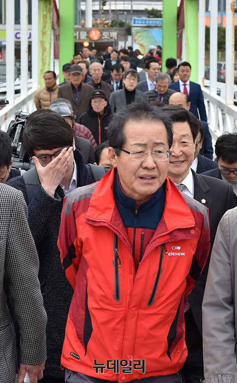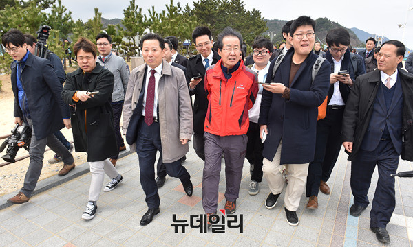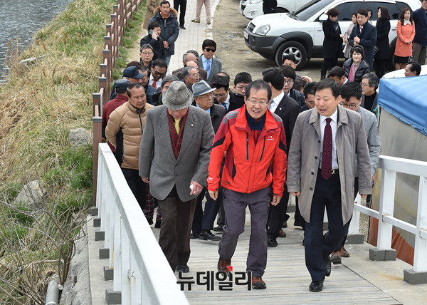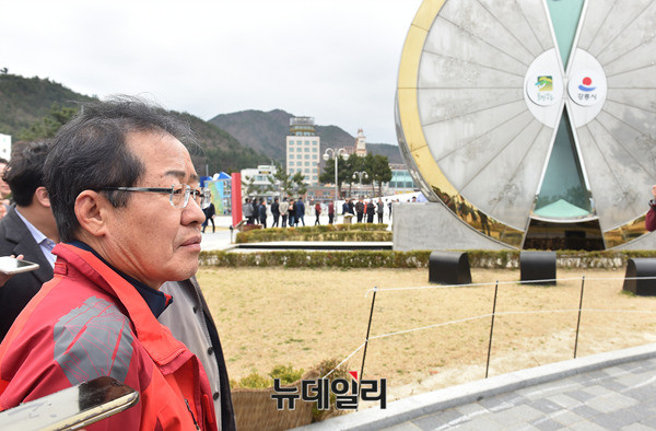 자유한국당 홍준표 대선주자가 25일 오후 강릉 정동진 모래시계 공원을 방문해 이철규(강원 동해) 국회의원의 안내로 공원을 둘러보고 있다. 이어 홍 주자는 평창 동계올림픽 조직위원회를 방문할 예정이다. (강원 강릉=뉴데일리 이종현 기자)