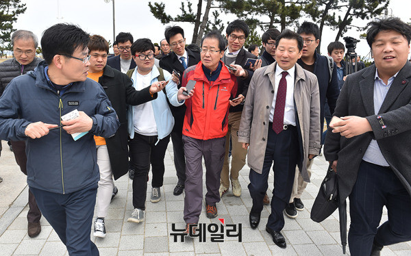 자유한국당 홍준표 대선주자가 25일 오후 강릉 정동진 모래시계 공원을 방문한 후 기자들과 만나 간담회를 갖고 있다. 이어 홍 주자는 평창 동계올림픽 조직위원회를 방문할 예정이다. (강원 강릉=뉴데일리 이종현 기자)