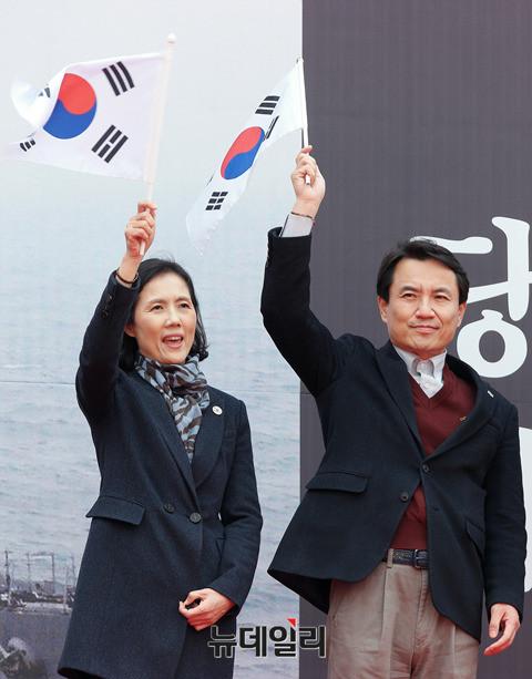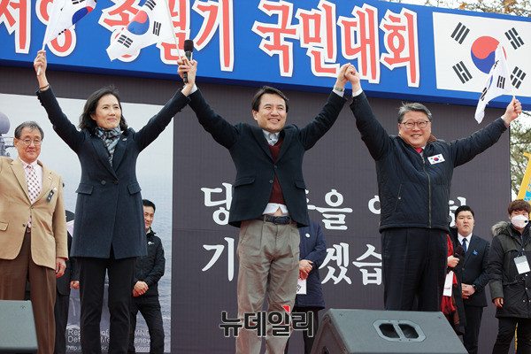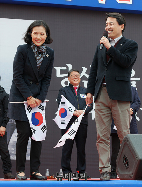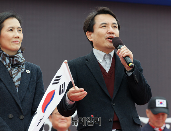 자유한국당 김진태 대선주자가 부인 원현순 여사와 25일 오후 대한문에서 열린 대통령탄핵무효국민저항총궐기운동본부(탄기국) 제3차 탄핵무효 태극기집회에 참석해 태극기를 흔들며 인사하고 있다.