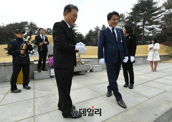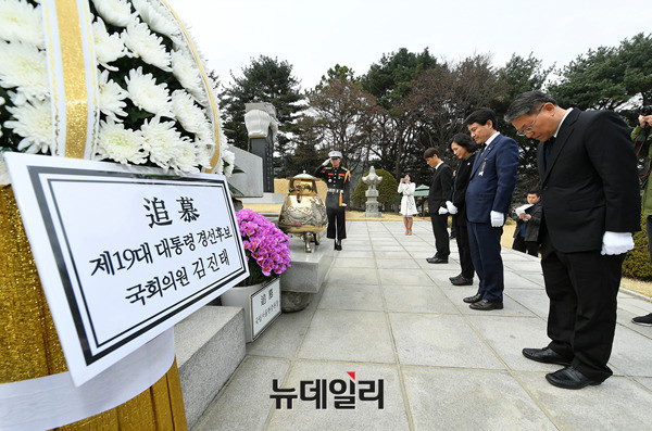 자유한국당 김진태 대선주자가 26일 오후 서울 동작구 국립서울현충원을 찾아 이승만 전 대통령 묘역을 찾아 분향하고 있다. 이날 현충원을 찾은 김 주자는 현충탑에 참배하고 이승만, 박정희, 김영삼 전 대통령 묘역을 찾아 각각 참배했다.