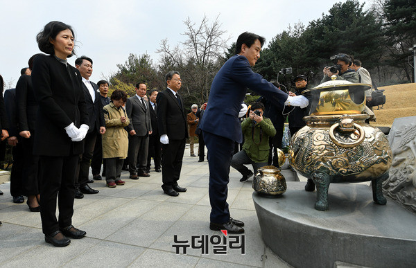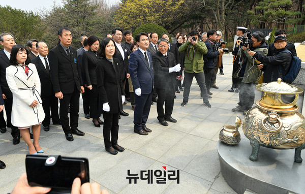 자유한국당 김진태 대선주자가 26일 오후 서울 동작구 국립서울현충원에서 박정희 전 대통령 묘역을 찾아 분향하고 있다. 이날 현충원을 찾은 김 주자는 현충탑에 참배하고 이승만, 박정희, 김영삼 전 대통령 묘역을 찾아 각각 참배했다.