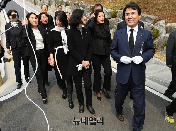 자유한국당 김진태 대선주자가 26일 오후 서울 동작구 국립서울현충원을 찾아 현충탑과 이승만, 박정희, 김영삼 전 대통령 묘역을 찾아 각각 참배한 후 차에올라 지지자들과 인사를 나누고 있다.