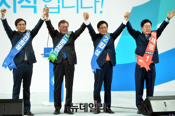 안희정, 문재인, 최성, 이재명(왼쪽부터) 더불어민주당 대선주자가 27일 오후 전남 광주여대시립유니버시아드체육관에서 열린 더불어민주당 '제19대 대통령후보자 호남권역선출대회'에서 손을 들어보이고 있다.